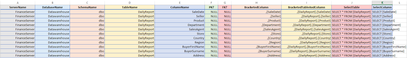 This process can be repeated for every database server used by the business to generate a single mapped servers master excel file allowing the user to find any table or column available to the organization quickly.